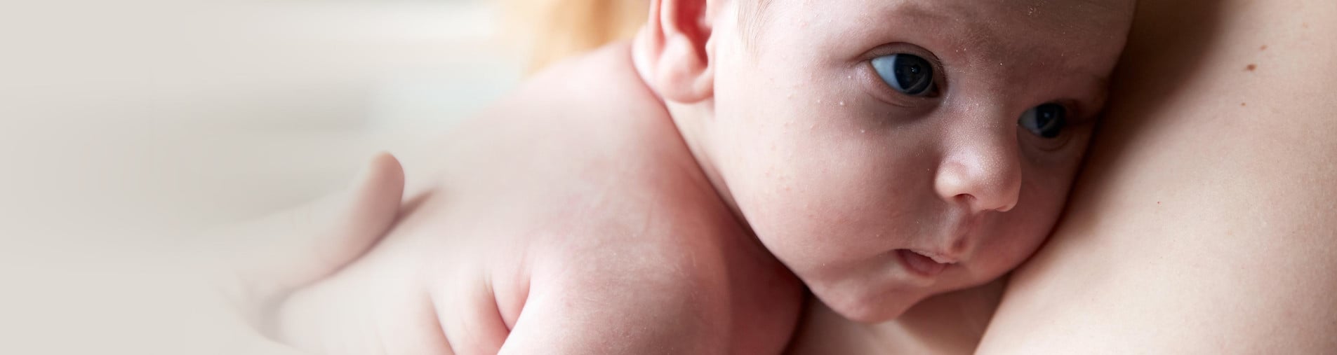 A baby rests its head on an adult's shoulder, gazing intently to the side. The background is softly blurred, drawing focus to the baby's face.