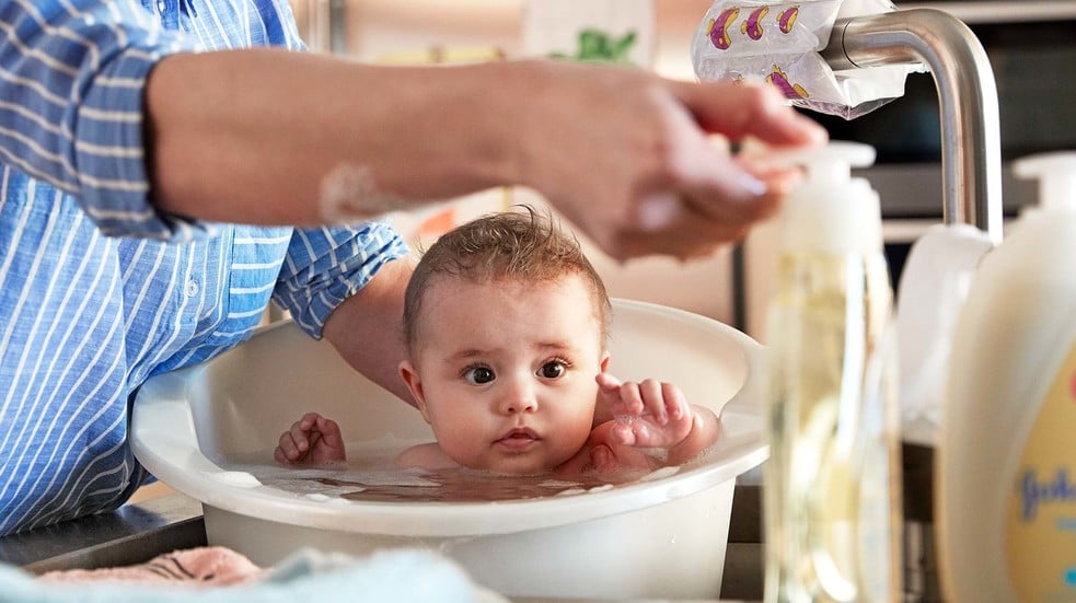 Baby in a bathtub being bathed, handheld by an adult wearing a blue striped shirt, in a kitchen setting with soap and faucet visible nearby.